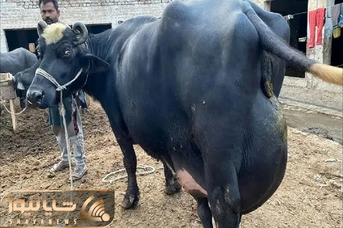 این گاو سیاه انقدر شیرش زیاده و ندوشیدنش نمیتونه راه بره یه نفر داره از جلو به زور میبرتش.