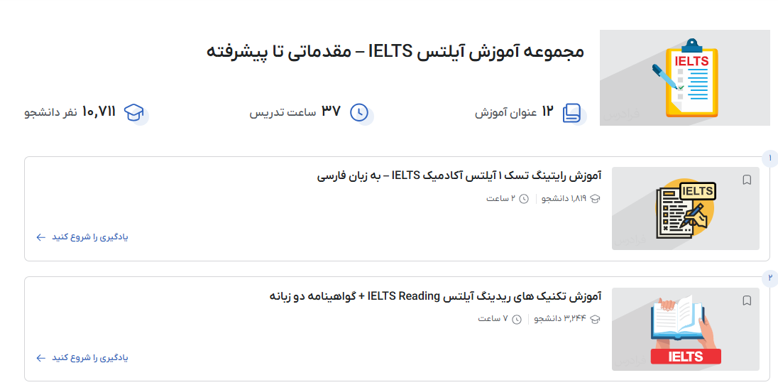 این دوره شامل عنوانهای آموزشی متنوعی میشود که به صورت جامع و کاربردی تهیه شدهاند تا بتوانید به نتیجه دلخواه خود برسید. همچنین در این مجموعه فیلمهای آموزش آیلتس یاد میگیرید که چطور برای هر بخش از آزمون آماده شوید و با برخی از اشتباهات رایج داوطلبان و روشهای رفع آنها آشنا میشوید. برای مشاهده مجموعه آموزشهای آیلتس از فرادرس روی لینک زیر کلیک کنید.