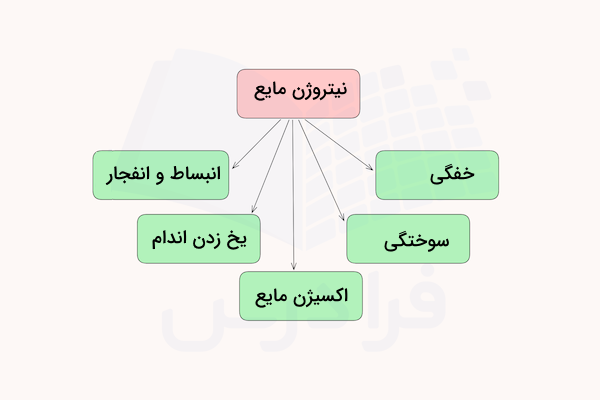 نیتروژن مایع یک مایع کریوژنیک و بسیار سرد است. این ماده میتواند در صورت تماس با پوست باعث سوختگیهای شدید شود و در صورت جذب گرما در محیط بسته، خطر انفجار ظرف وجود دارد. در ادامه، برخی از مهمترین خطرات این ماده را نام میبریم.