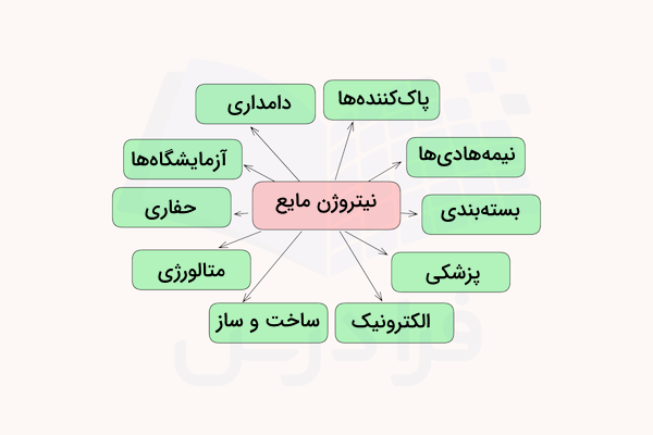 با توجه به دمای بسیار پایین و اینرسی این ماده، از نیتروژن مایع در بسیاری از صنایع استفادههای بسیاری میشود. برخی از استفادههای این ماده، سرمایش مواد غذایی، سینیهای خنک کننده و … هستند. برخی از کاربردهای این ماده را در ادامه توضیح میدهیم.