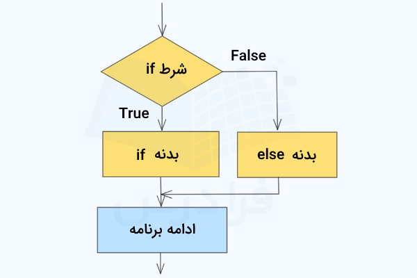 در ساختار if ساده دیدیم که اگر شرط برقرار نباشد، برنامه آن را نادیده گرفته و ادامه کار خود را انجام میدهد. اما بعضی از وقتها لازم است که در صورت برقرار نبودن شرط هم عکسالعمل دیگری نشان بدهیم. برای انجام این کار از بلوک else استفاده میکنیم. کدهای نوشته شده در این بلوک در صورت برقراری شرط اجرا نمیشوند. فقط زمانی این کدها اجرا میشوند که شرط برقرار نباشد.