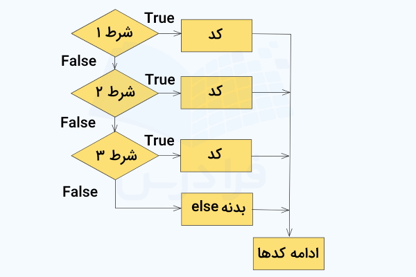 در فلوچارت زیر، تصویری از ساختار تصمیمگیری if-elif رسم شده است. در این تصویر یک بلوک if و دو بلوک elif و یک else وجود دارند.