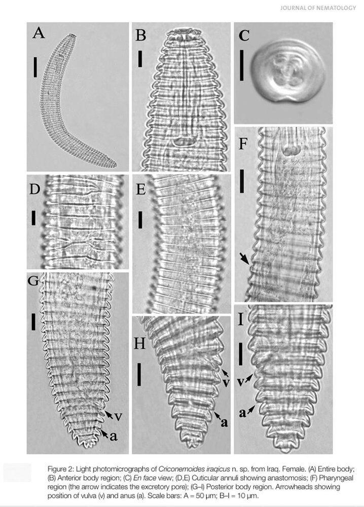 به گزارش ایسنا، بنا بر اعلام دانشگاه در روز شنبه ۲۶ مهر، در بررسی «نماتدهای انگل گیاهی» در کشور عراق(استان میسان) که در پی انجام رساله دکتری احمد مالک جمعه، دانشجوی رشته «بیماریشناسی گیاهی» انجام شد، گونهای جدید از «نماتدها» برای دنیای علم کشف شد که با نام «Criconemoides iraqicus» نامگذاری شده است. گونه مذکور نخستین گونه نماتدی است که از کشور عراق توصیف شده است.