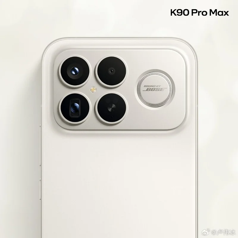در تصاویر منتشرشده از سوی ردمی، نسخه سفید رنگ Redmi K90 Pro Max به نمایش درآمده که طراحی ظریف و مدرنی دارد. نمایشگر با حاشیه‌های بسیار باریک و گوشه‌های گرد طراحی شده و در پشت بدنه، یک ماژول مستطیلی بزرگ دوربین در قسمت بالا دیده می‌شود. حسگرهای دوربین و فلش LED در سمت چپ ماژول قرار دارند و در سمت راست، برند “Sound by Bose” به چشم می‌خورد که نشان‌دهنده استفاده از سیستم صوتی تنظیم‌شده توسط Bose و کیفیت صوتی بالا است.