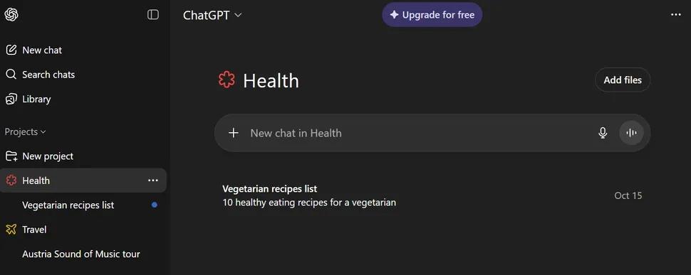 راه‌اندازی Projects ساده است: به بخش سمت چپ ChatGPT می‌روید، روی “Projects” کلیک می‌کنید و سپس با دکمه “+ New Project” پروژه جدیدی ایجاد می‌کنید. برای مثال، پروژه‌هایی با عنوان Health و Travel ساخته و پس از افزودن یادداشت‌ها و لینک‌های مرجع، ChatGPT به طور خودکار همه اطلاعات مرتبط را در محیط پروژه متصل می‌کند.