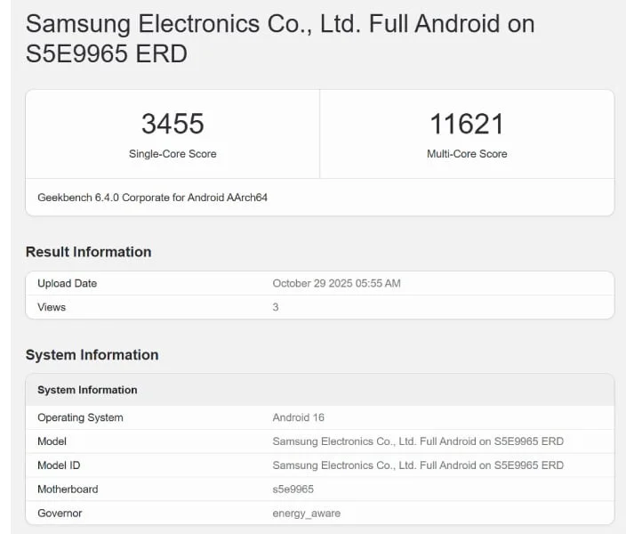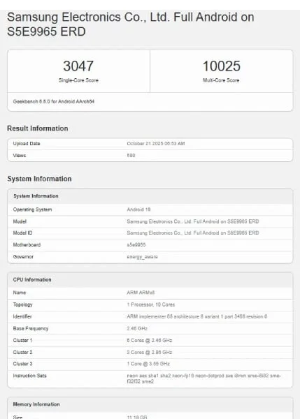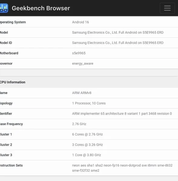 نکته جالب توجه این است که سامسونگ ممکن است روی دو نسخه متفاوت از Exynos 2600 کار کند. هفته گذشته، نسخه‌ای با فرکانس پایین‌تر نیز در Geekbench مشاهده شد که در آن، هسته‌ی اصلی با ۳.۵۵ گیگاهرتز، سه هسته‌ی عملکردی با ۲.۹۶ گیگاهرتز و شش هسته‌ی کارآمد با ۲.۴۶ گیگاهرتز فعالیت می‌کردند. مطابق انتظار، امتیازات این نسخه پایین‌تر بود — ۳٬۰۴۷ در تک‌هسته‌ای و ۱۰٬۰۲۵ در چندهسته‌ای.