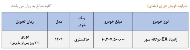 بر اساس این طرح فروش، وانت زامیاد EX دوگانه سوز در رنگ خاکستری و با قیمت 1 میلیارد و 30 میلیون و 750 هزار تومان عرضه میشود. موعد تحویل این خودرو فوری و 30 روز پس از پذیرش اعلام شده است. متقاضیان میتوانند جهت کسب اطلاعات بیشتر و ثبت نام از تاریخ ذکر شده به سایت فروش اینترنتی گروه خودروسازی سایپا به نشانی https://saipa.iranecar.com مراجعه کنند.