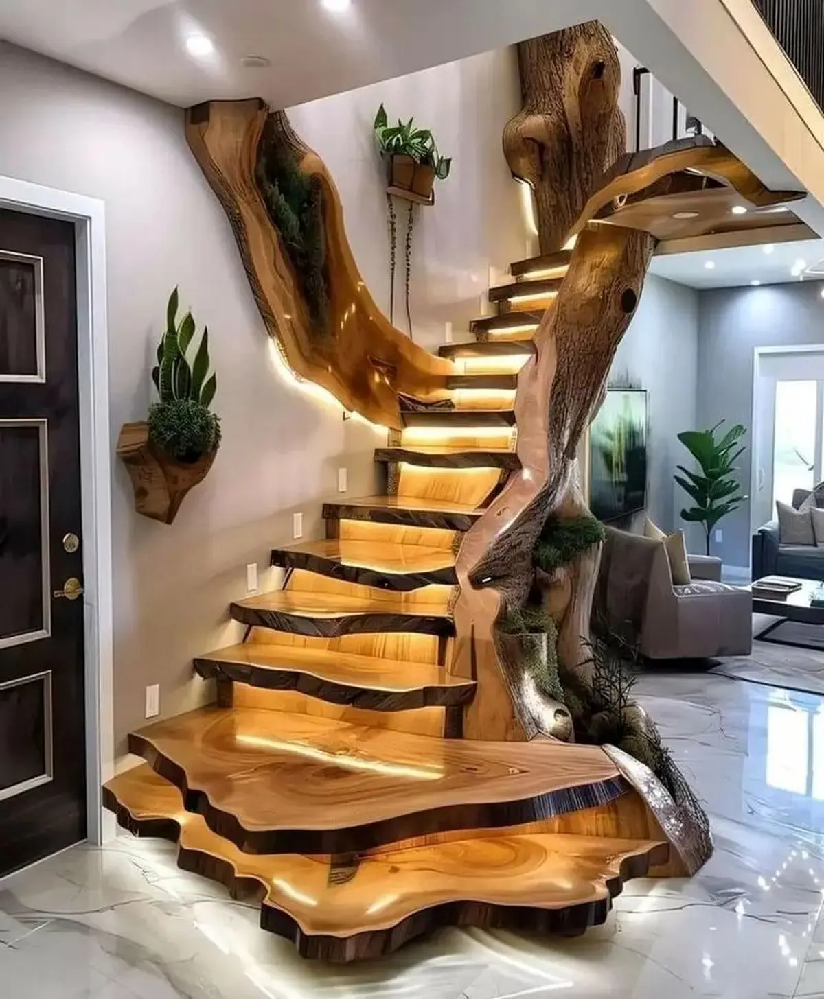 اگر دنبال فضایی گرم و دلنشین هستید، راه‌پله‌های چوبی با نرده‌های منبت کاری شده بهترین گزینه‌اند. این نوع طراحی به ویژه در خانه های دوبلکس با دکوراسیون کلاسیک یا نئوکلاسیک، هماهنگی و جلوه‌ای بی نظیر ایجاد می‌ کند. چوب طبیعی با رنگ های گرم مثل گردویی یا ماهگونی، فضایی صمیمی و در عین حال باشکوه میسازد و فرم های منحنی پله‌ها، جلوه‌ای نرم و چشم‌نواز به محیط میدهد. این سبک برای کسانی که به دنبال ترکیبی از اصالت، لوکس بودن و راحتی در فضای خانه هستند، فوق‌العاده مناسب است و نگاه هر بیننده ای را به خود جلب می کند.