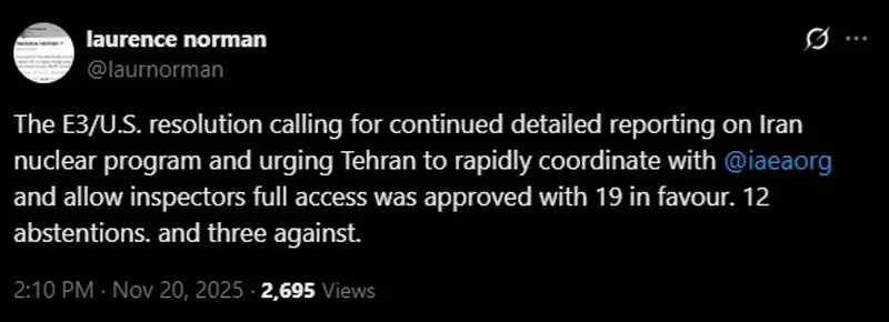 لارنس نورمن، خبرنگار وال استریت ژورنال در حساب کاربری خود در شبکه ایکس از تصویب یک قطعنامه علیه ایران در شورای حکام خبر داد.
