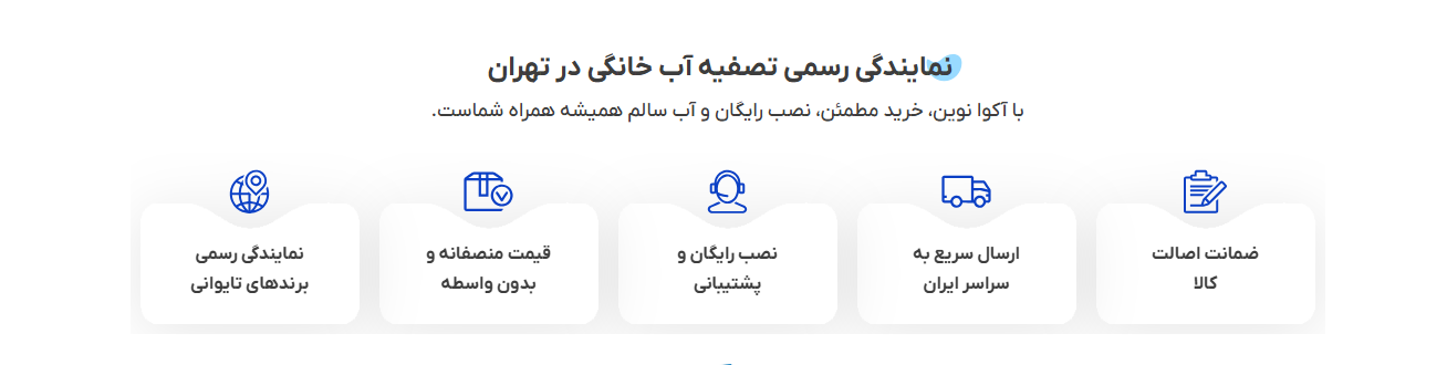 - نصب و سرویس اولیه رایگان: آکوا نوین برای تمامی محصولات خود، نصب و راهاندازی رایگان را به همراه یک دست فیلتر مراحل 1 تا 3 بهصورت رایگان ارائه میدهد