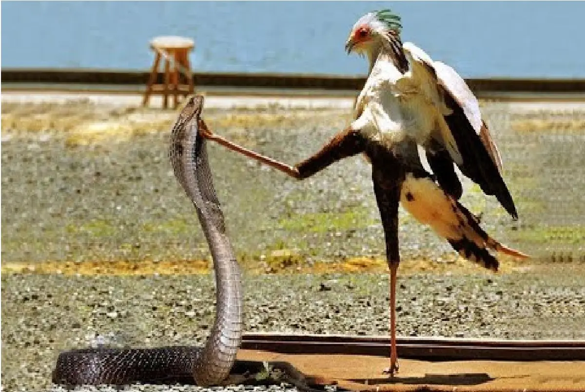 برخلاف سایر پرندگان شکاری که به چنگال های تیز تکیه می کنند، پرنده منشی با پای پیاده شکار می کند و لگدهای قدرتمندی را برای تسخیر طعمه میزند.