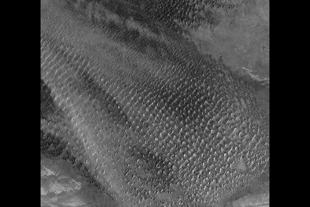 در این عکس راداری ثبت‌شده در سپتامبر ۲۰۲۵، اثر موجی نشان‌دهنده تراکم بالای تپه‌های شنی موازی است؛ از جمله برخی از بلندترین تپه‌های شنی جهان که یکی از آنها به ارتفاع بی‌سابقه ۴۶۰ متر می‌رسد. اگرچه بیشتر تپه‌های شنی به دلیل جابه‌جایی شن، پویایی دارند اما بلندترین تپه‌ها معمولاً ثابت با هسته جامد هستند و در زمستان از برف پوشیده می‌شوند.