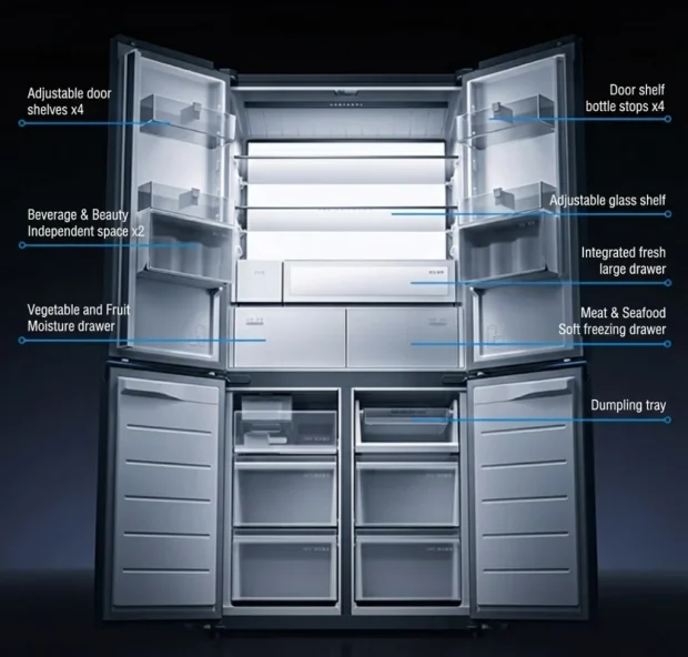 فضای داخلی به ۱۸ بخش مجزا تقسیم شده تا نظمدهی به مواد غذایی آسانتر باشد. همچنین سیستم یخساز داخلی و تصفیه یونیزاسیون کل فضای یخچال از دیگر ویژگیهای برجسته آن است که محیطی بهداشتی و عاری از باکتری (با نرخ ۹۹.۹۹ درصد) را فراهم میکند.